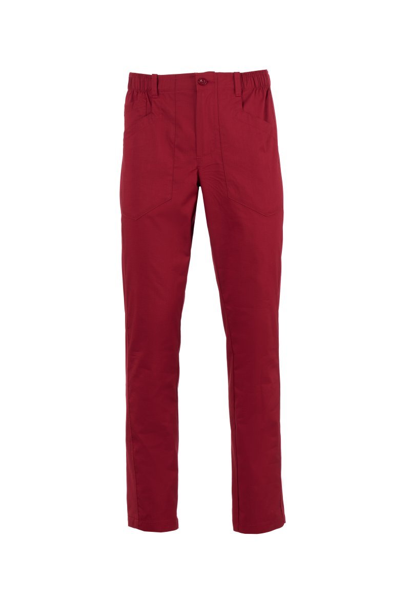 Calças multifuncionais para homem em ripstop de algodão e Lycra® T400®, com excelentes propriedades elásticas e respiráveis, com inserções laterais em tecido de malha confortável ao longo de todo o comprimento da perna exterior. Fecho de correr e botão, presilhas para cinto na cintura, faixa de transpiração elástica no interior da cintura. A frente tem dois bolsos moldados e um bolso para moedas. Na parte de trás, um bolso moldado. Fitas de reforço à cor.