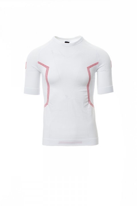 Tricou termic pentru bărbați, gât rotund, mâneci scurte tip raglan. Țesătură moale și elastică, cu texturi speciale pe piept și pe spate, motive elicoidale în relief pe părțile laterale, pentru a asigura o respirabilitate corespunzătoare și o termoreglare constantă. Gâtul, partea de jos și tivul de la mâneci din același material, pentru un confort mai bun. Format tubular ergonomic pentru a asigura o adaptare perfectă la fizionomia corpului.