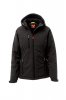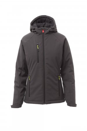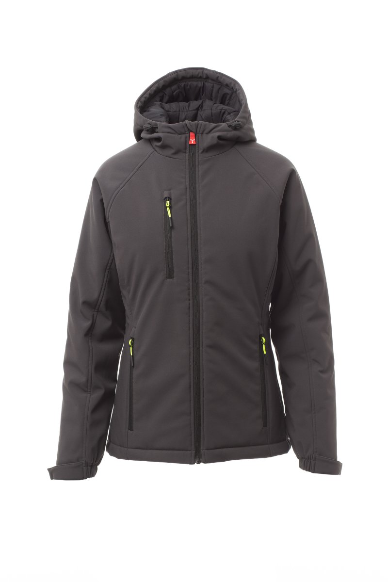 WP 8000 mm H₂O, WVT 5000 g/m² 24h. Soft-shell în 3 straturi, cu căptușeală caldă (160g/m²), pentru femei, închidere cu fermoar cu cursor metalic „semi-auto lock” și dispozitiv de tragere personalizat. Glugă fixă cu șnur reglabil. Manșete elastice, reglabile cu închidere cu scai. Două buzunare laterale și un buzunar la piept, închise cu fermoar. Dungi fluorescente. Două buzunare interioare, unul profilat cu fermoar și unul pentru tabletă cu închidere cu scai. Parte inferioară reglabilă cu opritor personalizat.