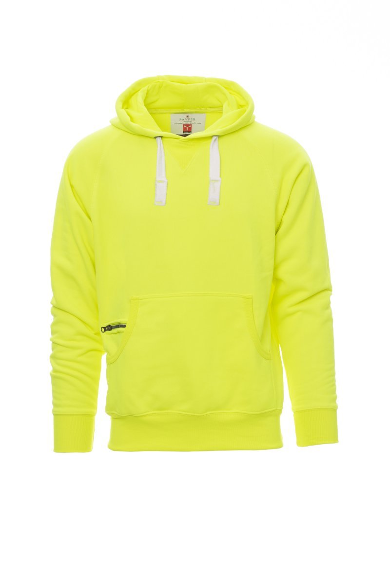 Hanorac pentru bărbați, cu glugă cu două cusături, șnur alb din material textil cu cusături în aceeași culoare cu hanoracul, cu ochiuri metalice, mânecă raglan, cusătură în V estetică la nivelul gulerului, buzunare de tip marsupiu, buzunar mic cu fermoar, bandă elastică la manșete și în talie, cusături întărite.