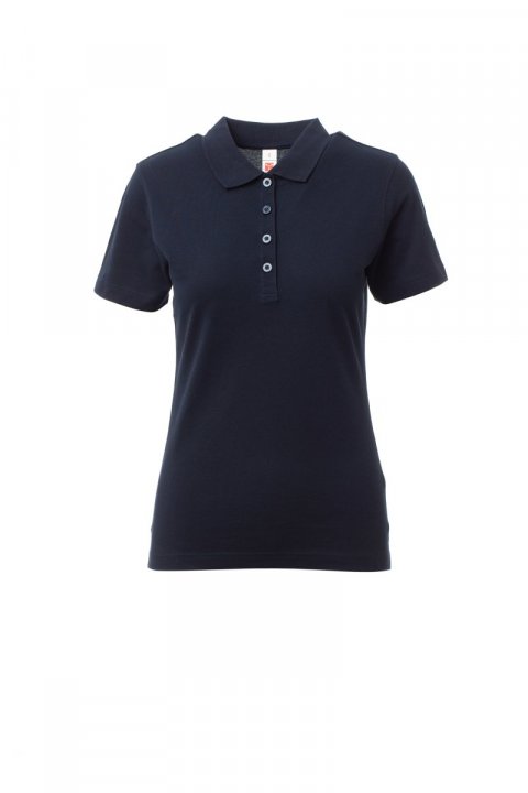 Tricou polo ajustat pentru femei cu mânecă scurtă, cu 4 nasturi colorați cu efect perlat, mici fante laterale, cusături ale gulerului acoperite cu bandă în aceeași culoare.