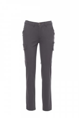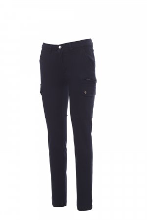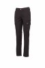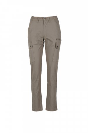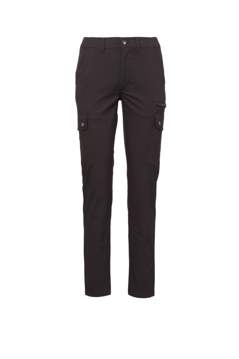 Pantaloni pentru femei, croială clasică, confecționați din material textil ripstop stretch, lejeri, cu părți elastice pe lateral și găici pentru centură în talie, închidere cu fermoar și nasture metalic, două buzunare față cu croială clasică, două buzunare laterale cu clapă și capse, un buzunar cu fermoar pe partea stângă, un buzunar dedicat ruletei de măsurat ce poate fi strâns, pe partea dreaptă, două buzunare spate cu butonieră și nasture.