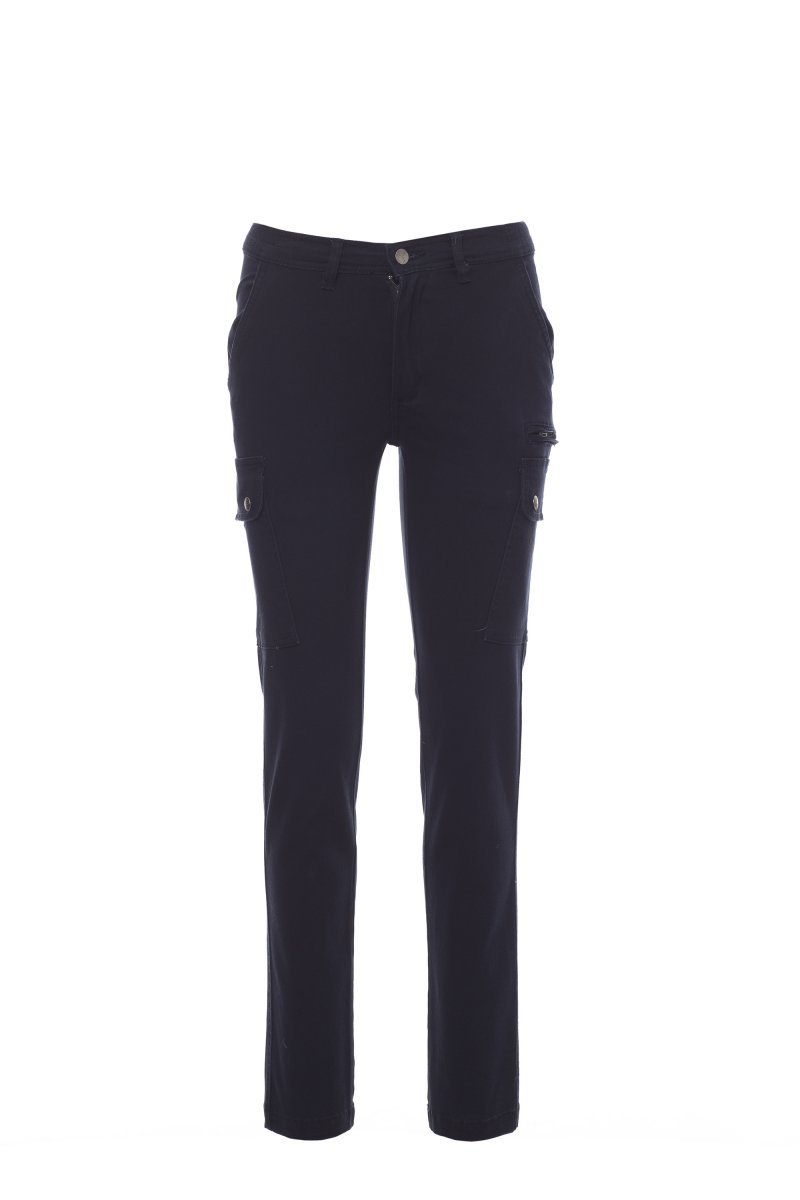 Pantaloni pentru femei, croială clasică, confecționați din material textil ripstop stretch, lejeri, cu părți elastice pe lateral și găici pentru centură în talie, închidere cu fermoar și nasture metalic, două buzunare față cu croială clasică, două buzunare laterale cu clapă și capse, un buzunar cu fermoar pe partea stângă, un buzunar dedicat ruletei de măsurat ce poate fi strâns, pe partea dreaptă, două buzunare spate cu butonieră și nasture.