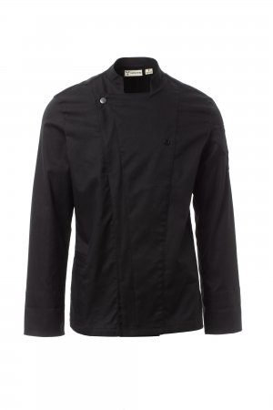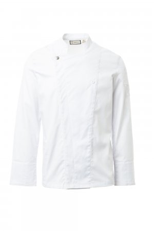 Jachetă de bucătar cu guler coreean, confecționată din stofă cu țesătură diagonală din bumbac și Lycra® T400®, cu proprietăți elastice și respirabile excelente. Închidere dublă pe piept cu capse metalice, clapetă care poate fi pliată și fixată la piept cu ajutorul unui singur nasture vizibil, creând efectul unui rever de croitorie și un guler în V inovator. Mâneci lungi cu manșetă întoarsă, cu întăritură din material textil tip plasă sub braț, pentru a permite pielii să respire. Aplicație cu formă iconică pe umărul stâng, cu broderie tip elice ton pe ton, cu buzunar pentru pix. Buzunar practic pentru smartphone în talie. Fante verticale în partea inferioară a spatelui, pentru a facilita mișcarea.
