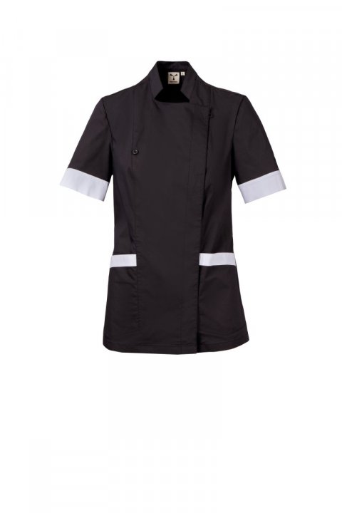 Dámsky plášť s krátkymi rukávmi so stojačikom, zo zmesovej tkaniny bavlneného popelínu, polyesteru a vlákna Lycra® T400®, s vynikajúcimi vlastnosťami, čo sa týka pružnosti a priedušnosti. Dvojradové zapínanie na patentné gombíky, s lemom, ktorý sa dá zahnúť a pripevniť na hrudi viazačkou a viditeľným gombíkom, čím sa vytvára efekt elegantnej chlopne a inovatívneho výstrihu do V. Kontrastná farba na lemoch rukávov a okrajoch vreciek. Dve vrecká v spodnej časti, z toho jedna s držiakom na smartfón. Ikona vrtule Payper vyšitá rovnakou farbou na rukáve. Rozparky vzadu a záhyby so zášivkami na chrbte.