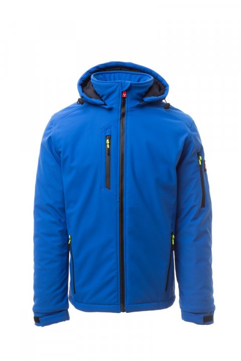 WP 8000 mm H₂O, WVT 5000 g/m² 24h. Moška 3-slojna soft-shell jakna s toplo podlogo (160 g/m²), ovratnikom z všivki iz flisa, zapiranjem z zadrgo SBS s kovinskim drsnikom in polavtomatskim zapiralnim mehanizmom ter personaliziranim jezičkom. Snemljiva kapuca z nastavljivo vrvico. Notranji ovratnik s stranskimi detajli iz flisa. Odsevni trakovi na zadnjem delu pasu in na zadnji strani kapuce. Elastične manšete na zapestjih, nastavljive z ježkom. Dva stranska žepa z zadrgo, en prsni žep s prevlečeno zadrgo in en žep na levem rokavu z integriranim držalom za pisalo in zapiranjem z zadrgo. Fluorescentni jezički zadrge. En notranji žep v obliki reže z zapiranjem na ježka. Nastavljiv spodnji rob s prilagojenimi zateznimi elastikami.