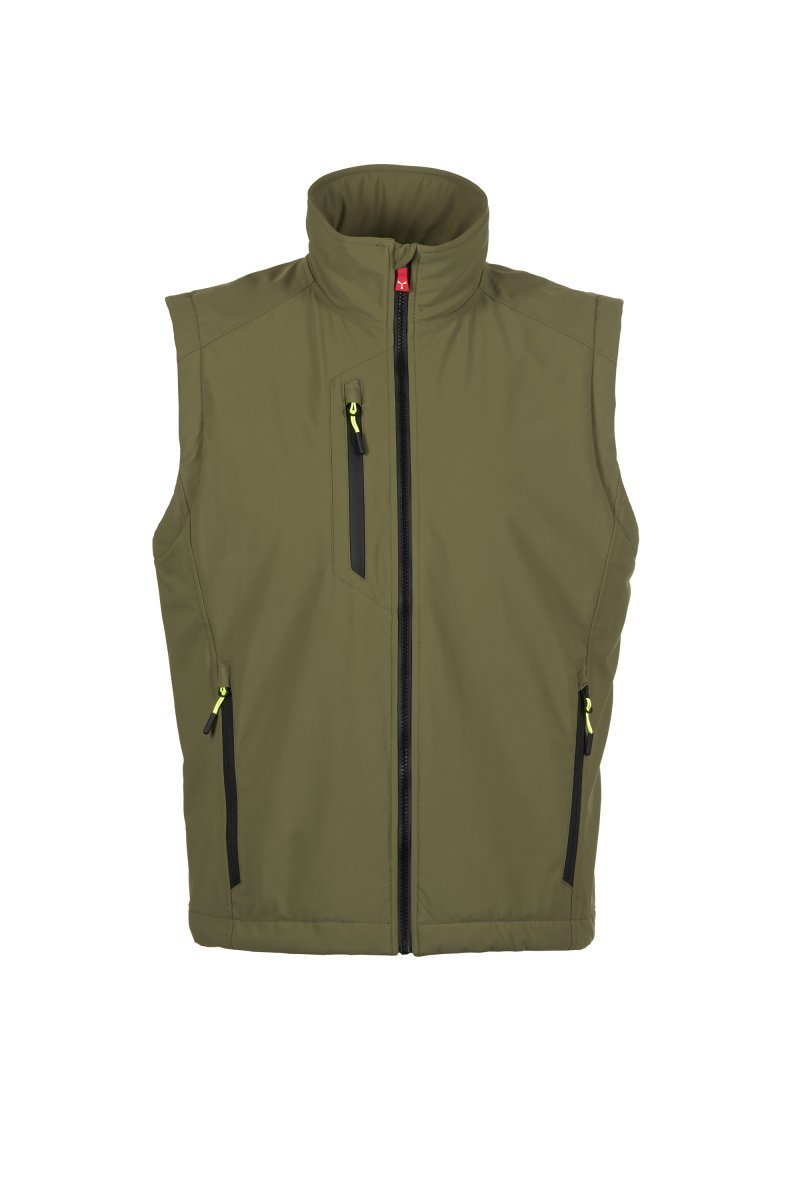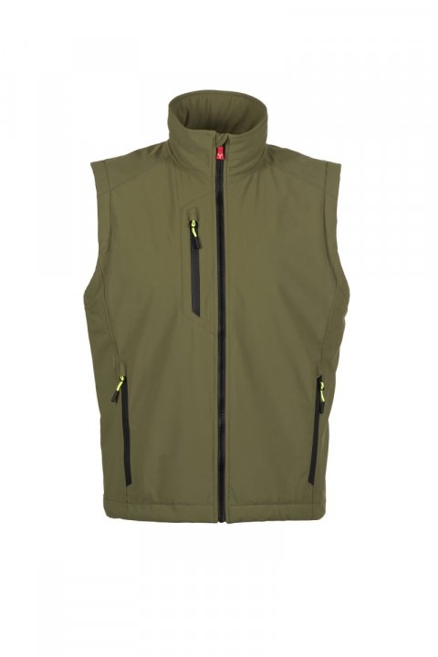 WP 8000 mm H₂O, WVT 5000 g/m² 24h. Moški soft-shell telovnik z 2 slojema in lahkim oblazinjenjem (100 g/m²), zapiranje z zadrgo SBS s kovinskim drsnikom in polavtomatskim zapiralnim mehanizmom ter prilagojenim jezičkom. Odsevni trak na zadnjem delu pasu. Dva stranska žepa z zadrgo, en prsni žep s prevlečeno zadrgo. Fluorescentni jezički zadrge. En notranji žep z zapiranjem na jeziček s trakom. Nastavljiv spodnji rob s prilagojenimi zateznimi elastikami.