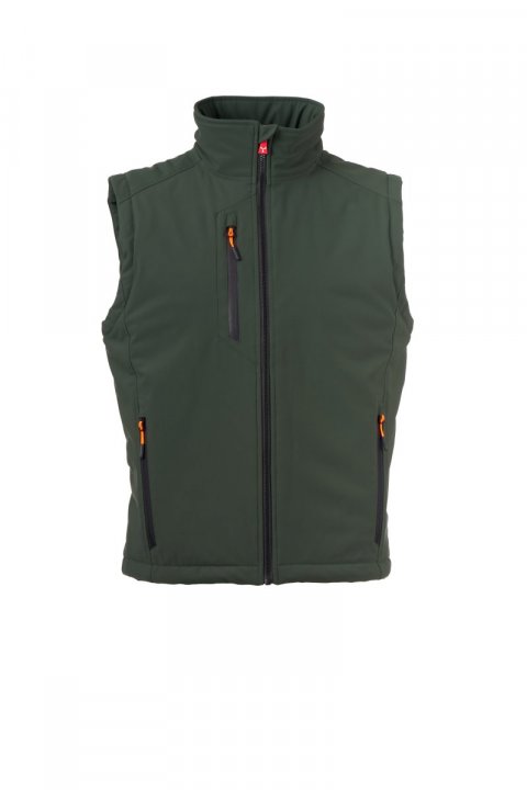 WP 8000 mm H₂O, WVT 5000 g/m² 24h. Moški soft-shell telovnik s 3 sloji in srednje toplo oblazinjenostjo (140 g/m²), zapiranje z zadrgo SBS s kovinskim drsnikom in polavtomatskim zapiralnim mehanizmom ter prilagojenim jezičkom. Odsevni trak na zadnjem delu pasu. Dva stranska žepa z zadrgo, en prsni žep s prevlečeno zadrgo. Fluorescentni jezički zadrge. En notranji žep z zapiranjem na jeziček s trakom. Nastavljiv spodnji rob s prilagojenimi zateznimi elastikami.