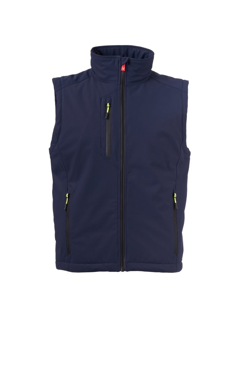WP 8000 mm H₂O, WVT 5000 g/m² 24h. Moški soft-shell telovnik s 3 sloji in srednje toplo oblazinjenostjo (140 g/m²), zapiranje z zadrgo SBS s kovinskim drsnikom in polavtomatskim zapiralnim mehanizmom ter prilagojenim jezičkom. Odsevni trak na zadnjem delu pasu. Dva stranska žepa z zadrgo, en prsni žep s prevlečeno zadrgo. Fluorescentni jezički zadrge. En notranji žep z zapiranjem na jeziček s trakom. Nastavljiv spodnji rob s prilagojenimi zateznimi elastikami.