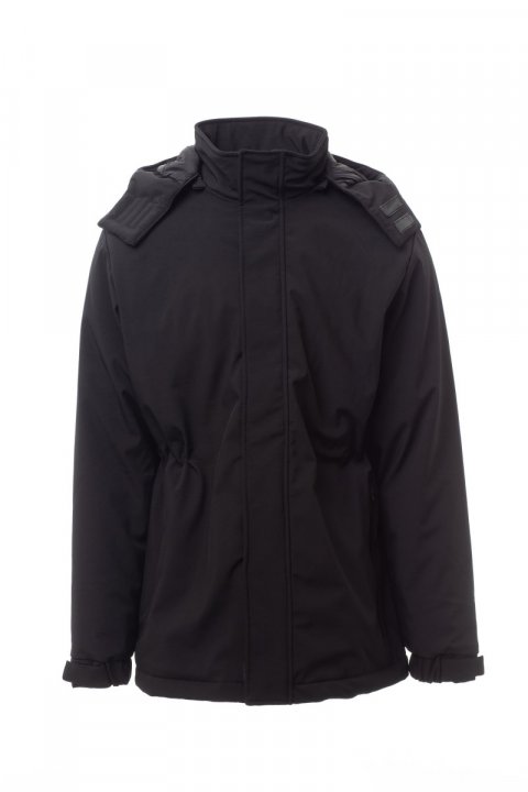 WP 8000 mm H₂O, WVT 5000 g/m² 24h. Podložena moška soft-shell jakna s 3 sloji in toplo oblazinjenostjo (160 g/m²), z zapenjanjem na ježka in zadrgo s kovinskim drsnikom s polavtomatskim zapiralnim mehanizmom ter prilagojenim jezičkom. Snemljiva kapuca, ki se spredaj zapenja z ježkom. Dva zunanja žepa s prevlečeno zadrgo, en notranji žep z obrobo in zapiranjem na ježka ter en notranji žep za tablični računalnik, prav tako zaprt z ježkom. Elastični patenti na zapestjih, nastavljivi z ježkom. Na zadnji strani ovratnika našitek po meri z odsevnim detajlom. Spodnji rob je nastavljiv s prilagojenimi zategovalniki.