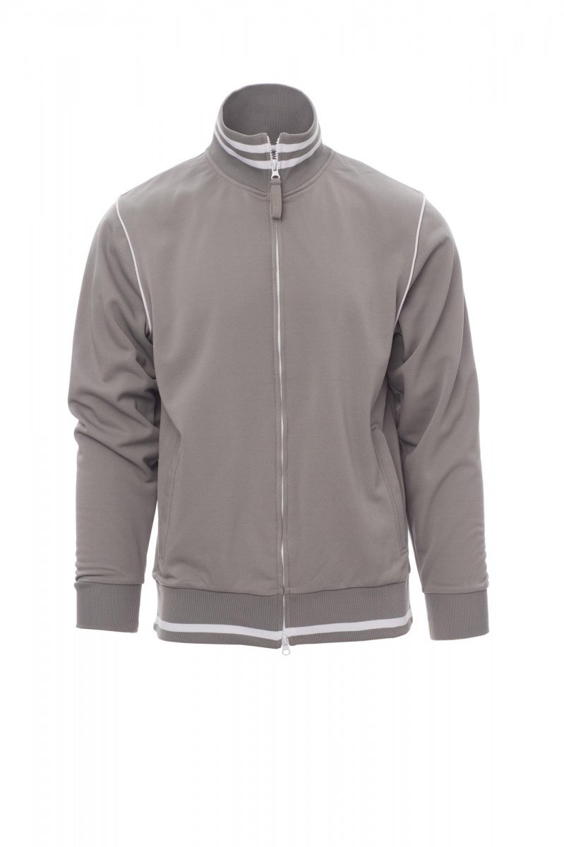 Moška jopa z dolgo plastično zadrgo v treh barvah z dvojnim kovinskim držajem. Rebrast ovratnik in spodnji rob s kontrastno obrobo, obrobljene raztegljive rebraste manšete, dva zunanja žepa z zadrgo, ojačani šivi, pike tkanina, ki omogoča boljšo zračnost.