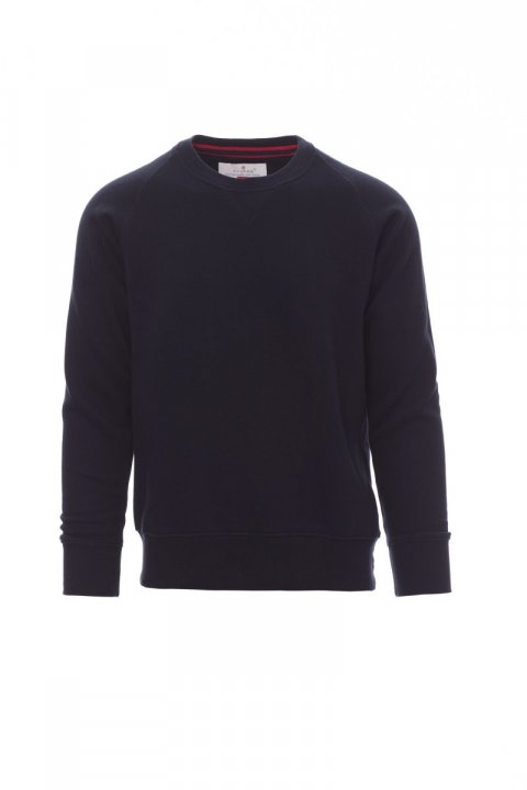 Moški pulover z okroglim izrezom, raglan rokavi, okrasno vezenje v V-obliki. Raztegljive rebraste manšete in spodnji rob, ojačani šivi.