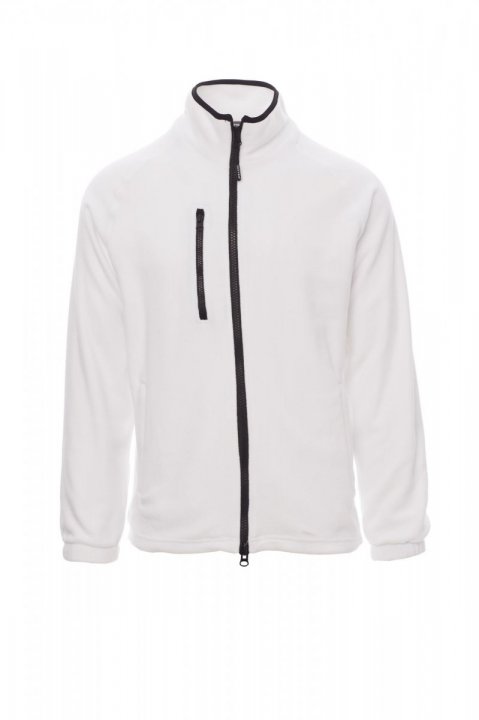 Moški flis s črno plastično 8 mm zadrgo, raglan rokavi, nastavljiva vrvica na pasu, elastični manšeti, dva žepa s skrito zadrgo, en prednji žep z zadrgo, ovratnik s kontrastnim ojačenim všitjem, ojačani šivi.