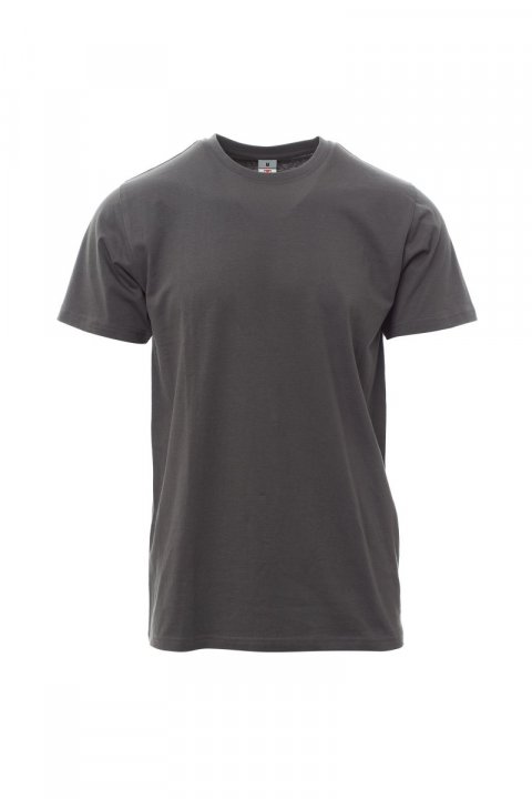 Moška enobarvna majica z o-izrezom, z ovratnim trakom iz elastana, ki v širino meri 1,5 cm, z našitkom spredaj v zgornjem delu, črtasta tekstura.