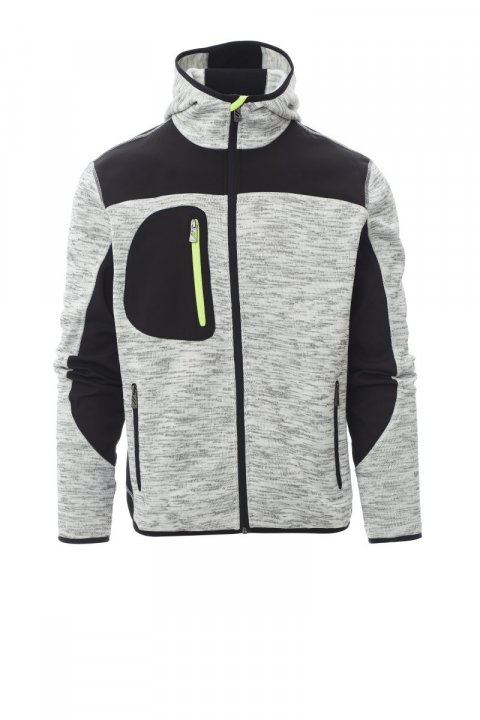 Tehnična majica z všitki iz črnega soft-shella, dvobarvna, udoben kroj, dolga zadrga SBS, kapuca z dvojnimi šivi in vrvico, tanki manšeti in spodnji rob, dva stranska žepa z zadrgo, en prsni žep.