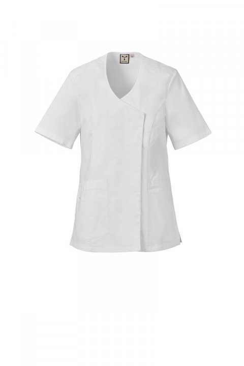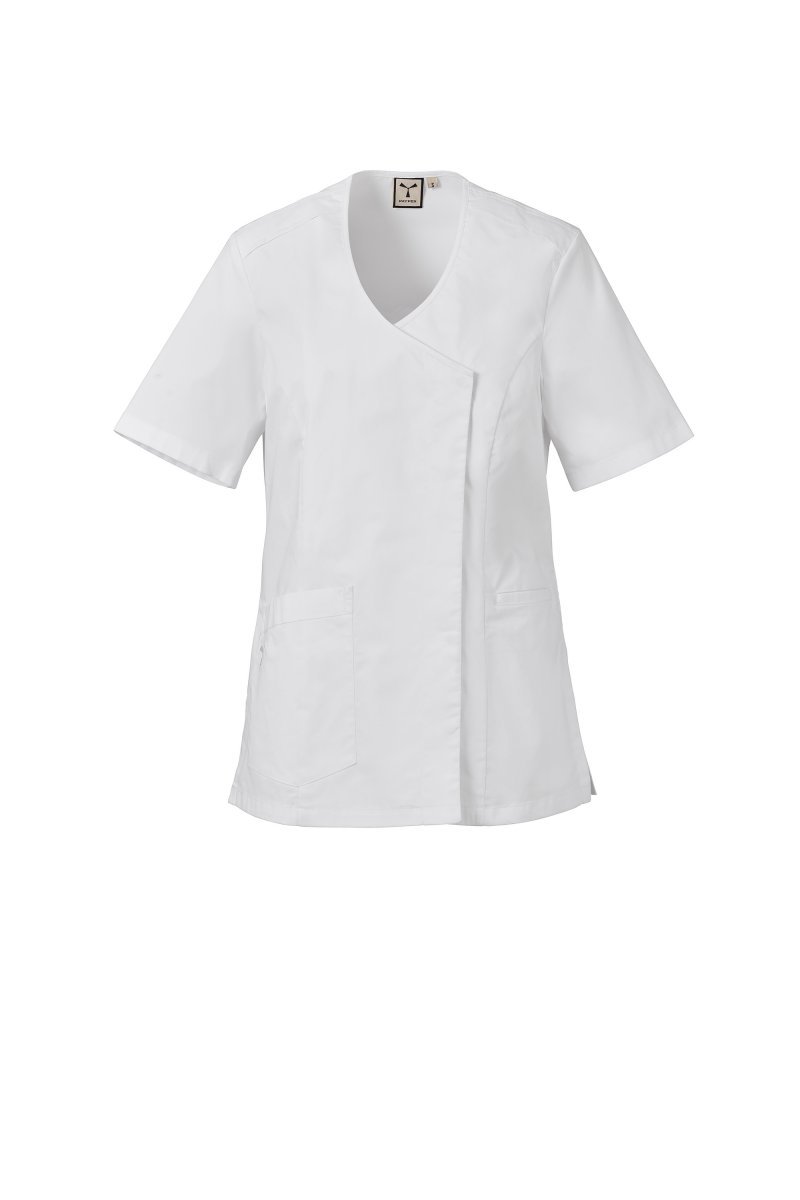 Ženska halja s kratkimi rokavi, izdelana iz bombažnega poplina, poliestra in materiala Lycra® T400®, z odličnimi elastičnimi in zračnimi lastnostmi. V-izrez z robom v kontrastni barvi. Zapenjanje s skritimi pritiskači in všitek iz tanke mrežice pod pazduho za večjo zračnost. Dva nizka žepa: en všit žep in en našit žep z izvezenim ikoničnim logotipom v enakem odtenku. Stranski razporki in notranji šivi na hrbtni strani.