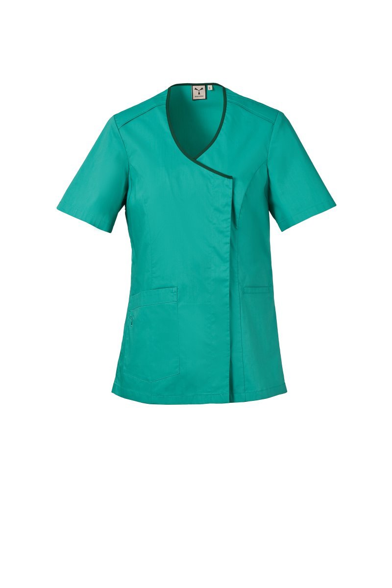 Ženska halja s kratkimi rokavi, izdelana iz bombažnega poplina, poliestra in materiala Lycra® T400®, z odličnimi elastičnimi in zračnimi lastnostmi. V-izrez z robom v kontrastni barvi. Zapenjanje s skritimi pritiskači in všitek iz tanke mrežice pod pazduho za večjo zračnost. Dva nizka žepa: en všit žep in en našit žep z izvezenim ikoničnim logotipom v enakem odtenku. Stranski razporki in notranji šivi na hrbtni strani.