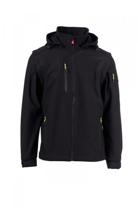 WP 8000 mm H₂O, WVT 5000 g/m² 24h Soft-shell me 3 shtresa për burra, me mëngë që hiqen, mbyllje me zinxhir SBS me kokë metalike "gjysmë-autolock" dhe tërheqëse koke të personalizuar. Kapuç që hiqet me kordonkaluese të rregullueshme. Shirita prapareflektues në fund të kurrizit dhe pas kapuçit. Mansheta elastike të rregullueshme me mbyllje me shqitje. Dy xhepa anësorë me zinxhir, një xhep në kraharor me zinxhir të lyer dhe një xhep në krahun e majtë me mbajtëse stilolapsi të integruar që mbyllet me zinxhir. Tërheqëse koke fluoreshente. Një xhep i brendshëm me fileto, mbyllje me shqitje. Fund i rregullueshëm me ndalues të personalizuar.