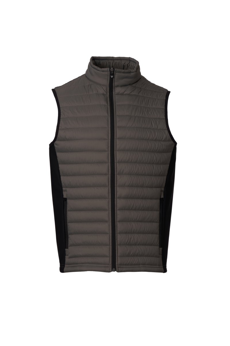 Jelek i mbushur (120g/m²) për burra, ijët me soft-shell, mbyllje me zinxhir plastik me kokë metalike "gjysmë-autolock" e tërheqëse koke të personalizuar. Dy xhepa anësorë me zinxhirë.