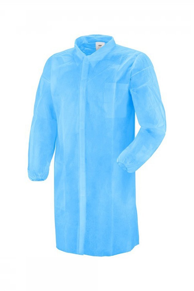 Fustan mbrojtës i disponueshëm, me mëngë të gjata, jo i endur. Përfshin një xhep të brendshëm me copë, mbyllje me grep dhe një rrip dore elastik. Kuti me 50 copë, të paketuara individualisht.
