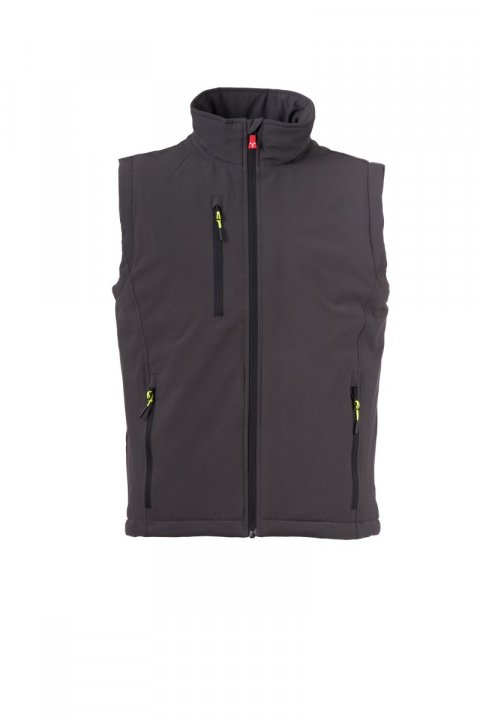 WP 8000 mm H₂O, WVT 5000 g/m² 24h. Muški softšel prsluk dvoslojne konstrukcije, sa srednjom postavom (140 g/m²). Zatvaranje pomoću rajsferšlusa sa metalnim klizačem sa funkcijom poluautomatskog zaključavanja i personalizovanim izvlakačem. Unutrašnji okovratnik sa bočnim detaljima od flisa. Dva bočna džepa i jedan grudni džep, zatvoreni rajsferšlusima. Fluorescentni klizači na rajsferšlusima. Dva unutrašnja džepa: jedan oblikovani sa rajsferšlusom i jedan za tablet sa čičak zatvaračem. Donji rub podesiv pomoću personalizovanih graničnika.