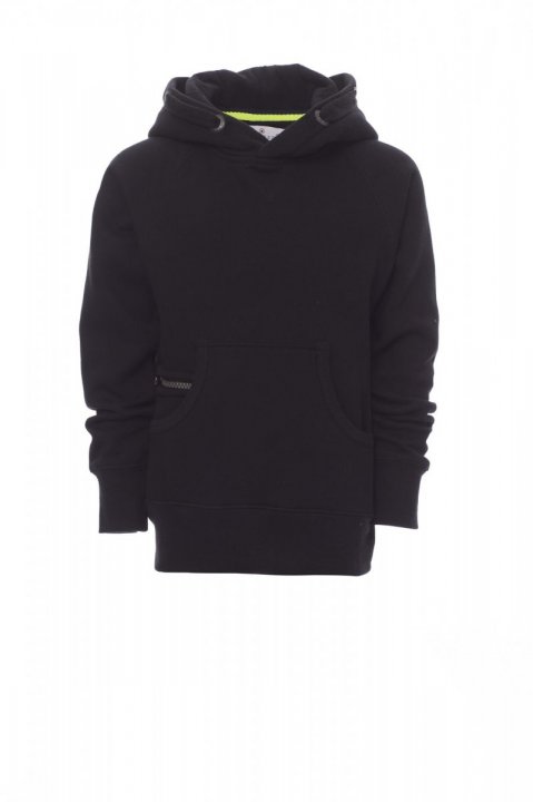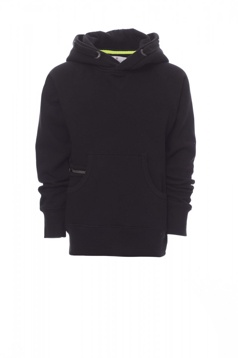 Dečja majica sa kapuljačom, dvostruko prošivenim šavovima, belom uzicom sa šavovima u boji majice i zatvaranjem sa dvostrukim metalnim prstenovima, raglan rukavima, ušivenim uzorkom V izreza, kengur džepovima, malim džepom sa patentnim zatvaračem, rastegljivim rebrastim manžetnama i donjim porubom te pojačanim šavovima.
