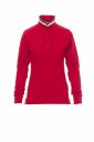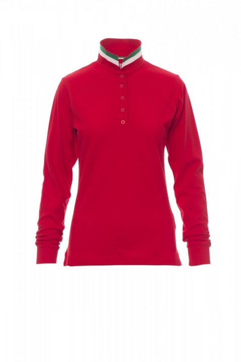 Zenska strukirana polo majica dugih rukava sa pet istih dugmadi bisernog uzorka, okovratnikom iste boje sa jedne strane i kontrastne boje sa druge strane, bojama zastave vidljivim samo kad je podignut, dugmadima na okovratniku i otvorima sa strana sa umetkom u boji zastave, šavovima oko vrata i manžetni, skrivenim šavovima na okovratniku, bočnom trakom za ojačanje i unutrašnjom trakom za ojačanje oko vrata.