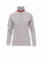 Zenska strukirana polo majica dugih rukava sa pet istih dugmeta bisernog uzorka, okovratnikom iste boje sa jedne strane i kontrastne boje sa druge strane, bojama zastave vidljivim samo kad je podignut, dugmadima na okovratniku i otvorima sa strana sa umetkom u boji zastave, šavovima oko vrata i manžetna, skrivenim šavovima na okovratniku, bočnom trakom za ojačanje i unutrašnjom trakom za ojačanje oko vrata
