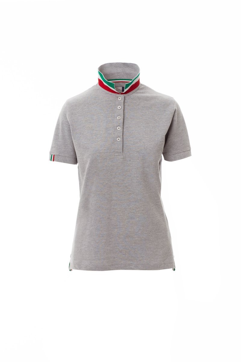 Ženska strukirana polo majica kratkih rukava sa pet istih dugmadi bisernog uzorka, okovratnikom iste boje sa jedne strane i kontrastne boje sa druge strane, sa bojama zastave vidljivim samo kad je podignut, sa porubom rukava sa umetkom u boji zastave u kontrastu, rebrastim obrubom rukava i okovratnikom, otvorima sa strana u boji zastave, šavovima oko vrata prekrivenim džerzijem u bojama zastave, bočnom trakom za ojačanje i unutrašnjom trakom za ojačanje oko vrata.