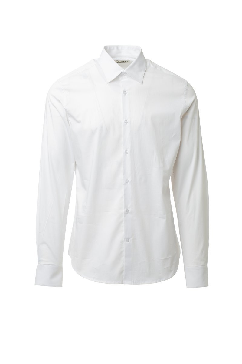Muška košulja, uski kroj. Italijanska profilisana kragna sa zatvorenim unutrašnjim ojačanjem i izmenjivim ojačanjima. Unutrašnji preklopni rub sa vidljivim kopčanjem. Dugmad sa efektom sedefa. Glatka ramenica na leđima. Strukovni šavovi na sredini leđa za bolje prijanjanje. Ojačanja od tkanine na bočnim šavovima. Zaobljene manžetne sa 2 dugmeta.