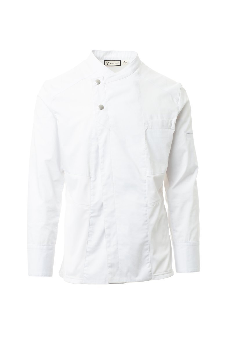 Kuvarska jakna sa okovratnikom, izrađena od nepoderivog pamučnog materijala i materijala Lycra® T400®, sa izvrsnim elastičnim i prozračnim svojstvima i sa udobnom mrežastom tkaninom na leđima, ispod pazuha, oko otvora za ruke i na bokovima kako bi se povećala prozračnost. Dvostruko kopčanje dugmadima. Dugi rukav sa manžetnom koja se zatvara pritiskom na dugme. Zakrpa u obliku ikone na visokom delu leđa, sa izvezenim spiralama u nijansi. Džep za olovke na levom ramenu i džep na grudima.