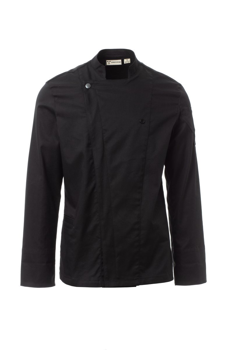 Kuvarska jakna sa korejskim okovratnikom, izrađena od pamučnog pletenog materijala i materijala Lycra® T400®, sa izvrsnim elastičnim i prozračnim svojstvima. Dvostruko kopčanje dugmadima, preklopom i pričvršćivanjem na grudima pomoću vidljivog kopčanja dugmadima, što stvara efekat krojačkog revera i inovativnog V-izreza. Dugi rukav sa okretnom manžetnom, mrežasti okvir od tkanine na kraju rukava, kako bi se olakšalo znojenje. Zakrpa u obliku ikone na levom ramenu, sa izvezenim spiralama u nijansi, opremljena džepom za olovke. Praktičan džep za pametni telefon u struku. Vertikalni prorezi na dnu kako bi se olakšalo pomeranje.