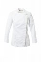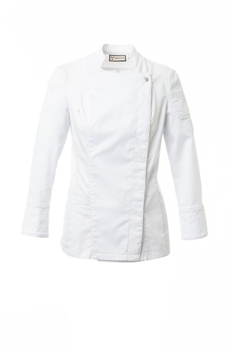 Kuvarska jakna sa korejskim okovratnikom, izrađena od pamučnog pletenog materijala i materijala Lycra® T400®, sa izvrsnim elastičnim i prozračnim svojstvima. Dvostruko kopčanje dugmadima, preklopom i pričvršćivanjem na grudima pomoću vidljivog kopčanja dugmadima, što stvara efekat krojačkog revera i inovativnog V-izreza. Dugi rukav sa manžetnom koja se zatvara pritiskom na dugme. Zakrpa u obliku ikone na levom ramenu, sa izvezenim spiralama u nijansi, opremljena džepom za olovke. Praktičan džep za pametni telefon u struku. Vertikalni prorezi na dnu kako bi se olakšalo pomeranje.