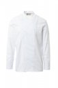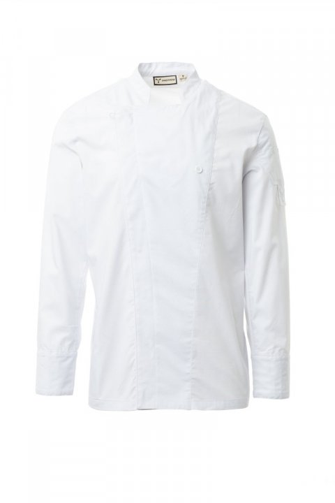 Kuvarska jakna sa korejskim okovratnikom, izrađena od nepoderivog pamučnog materijala i materijala Lycra® T400®, sa izvrsnim elastičnim i prozračnim svojstvima i sa udobnom mrežastom tkaninom na leđima, ispod pazuha i oko otvora za ruke kako bi se povećala prozračnost. Dvostruko kopčanje dugmadima, preklopom i pričvršćivanjem na grudima pomoću vidljivog kopčanja dugmadima, što stvara efekat krojačkog revera i inovativnog V-izreza. Dugi rukav sa manžetnom koja se zatvara pritiskom na dugme. Zakrpa u obliku ikone na levom ramenu, sa izvezenim spiralama u nijansi, opremljena džepom za olovke. Praktičan džep za pametni telefon u struku.