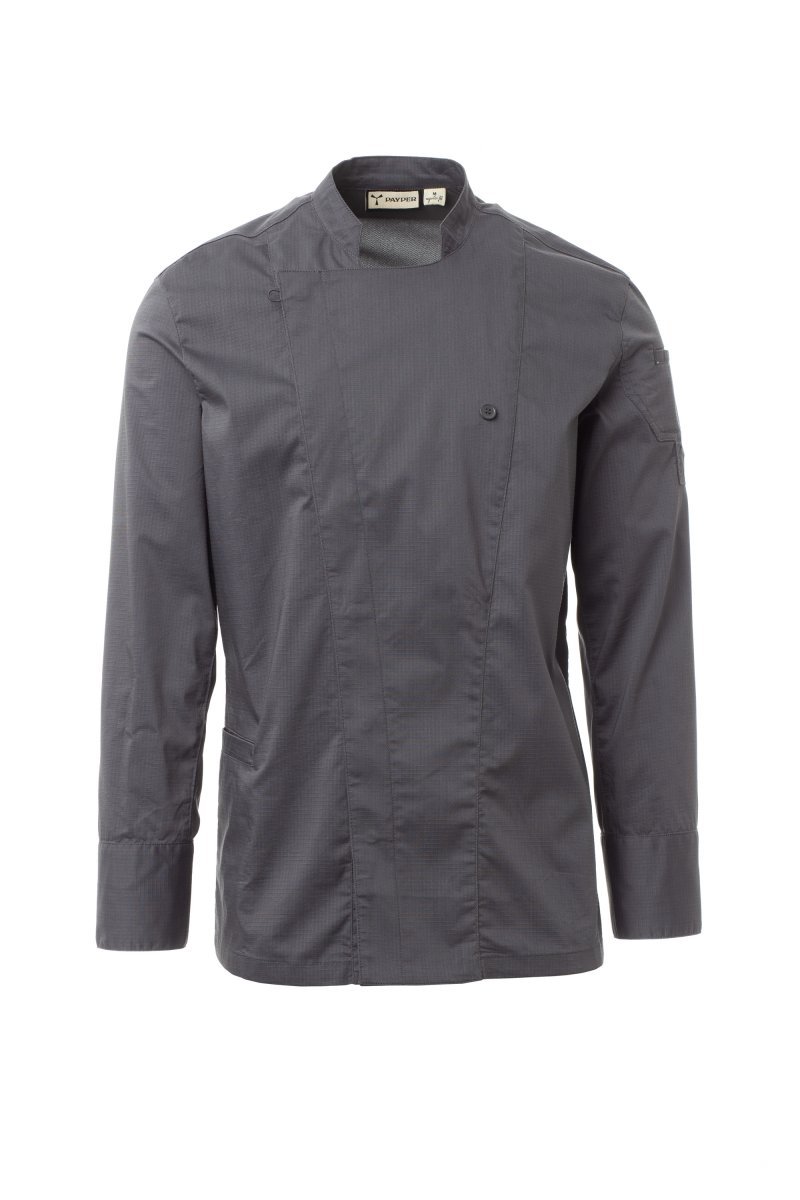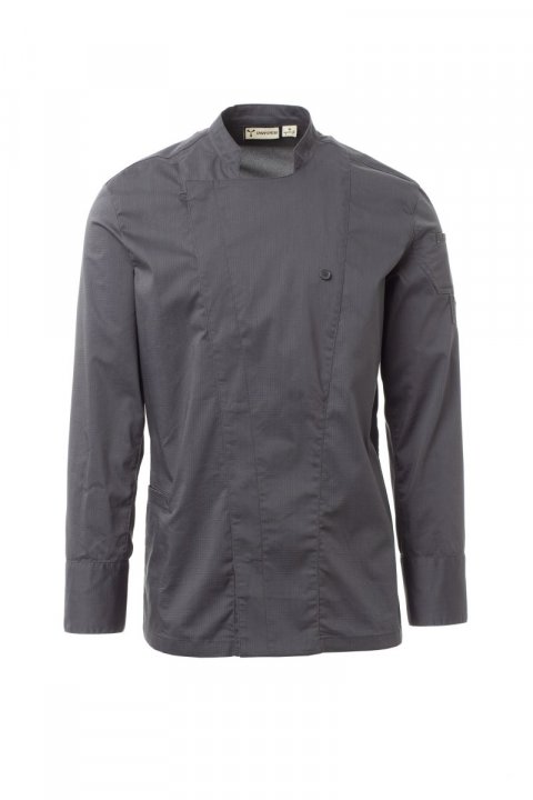 Kuvarska jakna sa korejskim okovratnikom, izrađena od nepoderivog pamučnog materijala i materijala Lycra® T400®, sa izvrsnim elastičnim i prozračnim svojstvima i sa udobnom mrežastom tkaninom na leđima, ispod pazuha i oko otvora za ruke kako bi se povećala prozračnost. Dvostruko kopčanje dugmadima, preklopom i pričvršćivanjem na grudima pomoću vidljivog kopčanja dugmadima, što stvara efekat krojačkog revera i inovativnog V-izreza. Dugi rukav sa manžetnom koja se zatvara pritiskom na dugme. Zakrpa u obliku ikone na levom ramenu, sa izvezenim spiralama u nijansi, opremljena džepom za olovke. Praktičan džep za pametni telefon u struku.