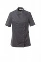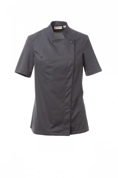 Kuvarska jakna sa korejskim okovratnikom, izrađena od pamučnog pletenog materijala i materijala Lycra® T400®, sa izvrsnim elastičnim i prozračnim svojstvima i sa udobnom mrežastom tkaninom na leđima, rukavima i u struku kako bi se maksimalno povećala prozračnost. Dvostruko kopčanje dugmadima, preklopom i pričvršćivanjem na grudima pomoću vidljivog kopčanja dugmadima, što stvara efekat krojačkog revera i inovativnog V-izreza. Kratki rukav sa porubom.