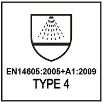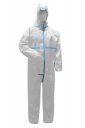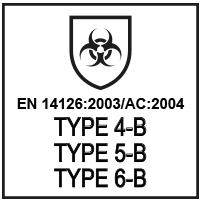 Jednokratno zaštitno odelo od bele netkane tkanine sa belom laminiranom spoljašnošću. Kapuljača sa elastičnim krajevima, elastične vezice na ručnom zglobu, elastične trake za palčeve, vezice na članku i vezice na struku. Zatvaranje zatvaračem pokrivenim lepljivim preklopom, plastičnim patentnim zatvaračem i metalnim delom za povlačenje. Toplotno spojeni šavovi sa modrom trakom kontrastnih boja. Lična zaštitna oprema III. kategorije vrste 4-B/5-B/6-B: delimična zaštita od tečnih hemijskih proizvoda sa hermetičkim zatvaranjem radi zaštite od prskanja (vrsta 4); zaštita od krutih čestica raspršenih u vazduhu (vrsta 5); ograničena zaštita od tečnih hemijskih materija (vrsta 6); zaštita od rizika od nakupljanja elektrostatičkog naboja; zaštita od infektivnih materija (B); zaštita od radioaktivne kontaminacije. Kutija od 50 komada pakovanih u pojedinačne kesice.