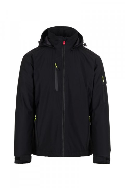 WP 8000 mm H₂O, WVT 5000 g/m² 24h. Softshelljacka för herr i två lager med lätt vaddering (100 g/m²), SBS-dragkedja med ”semi-autolås”-löpare av metall och kundanpassad dragtapp. Avtagbar huva med justerbar dragsko. Reflexband på nedre delen av ryggen och på baksidan av huvan. Elastiska muddar, justerbara med kardborrestängning. Två sidofickor med dragkedja, en bröstficka med belagd dragkedja och en ficka på vänster arm med integrerad pennhållare som stängs med dragkedja. Fluorescerande dragtappar. En infälld innerficka med kardborrestängning. Justerbar nederkant med kundanpassade förslutningar.