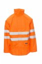 Regnjacka med hög synlighet och 3M-band, raglanärmar, heldragkedja i nylon och lock med tryckknappar, infällbar huva, dragsko i midjan, raka ärmar med resår på manschettens insida, två fickor med lock. Värmetejpade band och sömmar.