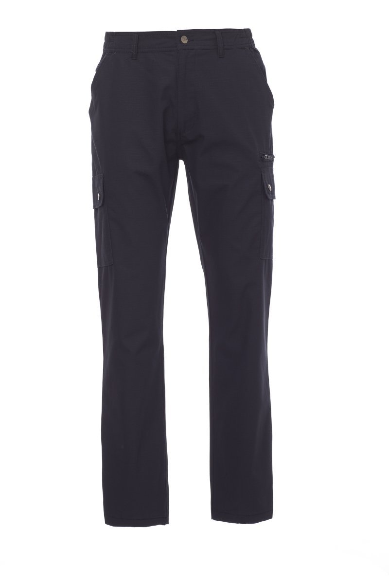 Herrbyxa, av lätt ripstop-stretchtyg, resårer i sidorna och bältesöglor i midjan, gylf med dragkedja och metallknapp, två klassiska framfickor, två sidofickor med lock och tryckknappar, en vänsterficka med dragkedja, en infällbar måttbandsficka till höger, två slitsade bakfickor med knapp och knapphål.