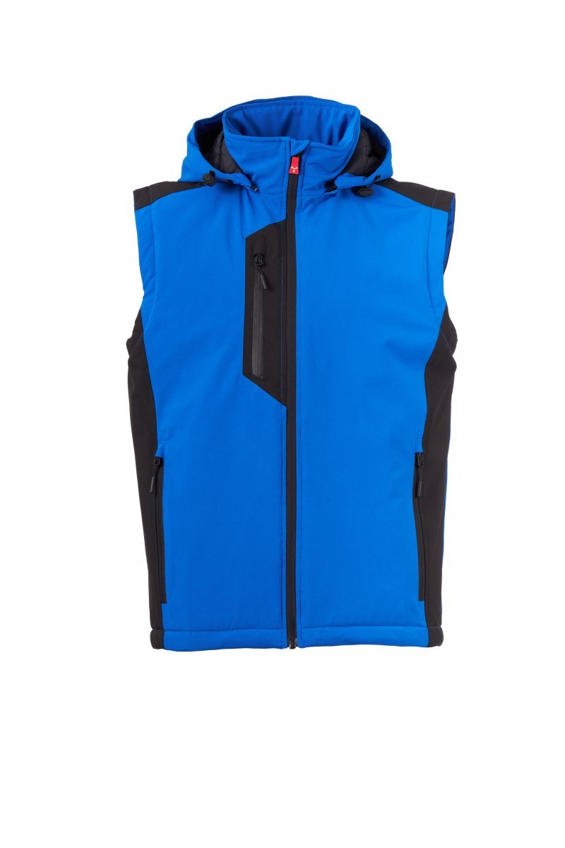 WP 8000 mm H₂O, WVT 5000 g/m² 24 sa. Metal "yarı otomatik kilit" sürgülü ve özelleştirilmiş çekme özellikli fermuarla kapanan, 2 katmanlı ve standart kapitone (140g/m²) erkek soft-shell yelek. Ayarlanabilir büzme ipli çıkartılabilir kapüşon. Fermuarlı iki yan cebi ve kaplama fermuarlı bir göğüs cebi vardır. Arka robada reflektif detay. Biri fermuarlı, diğeri cırtcırt ile kapatılmış tablet tutuculu iki iç cep. Kişiselleştirilmiş stoperli ayarlanabilir alt kısım.