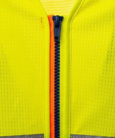 Üst kısmı nefes alabilir file ve alt kısmı dry-tech kumaştan yapılmış, omuz ve gövdesinde reflektif bantlar bulunan yüksek görünürlüklü yelek. SBS fermuarlı, iki renkli şeritli. Özelleştirme için dry-tech kumaş bant ve giysi giyildiğinde sol göğüste sabit yaka kartı tutucusu. Giysi giyildiğinde sağ göğüste çok fonksiyonlu kopça.