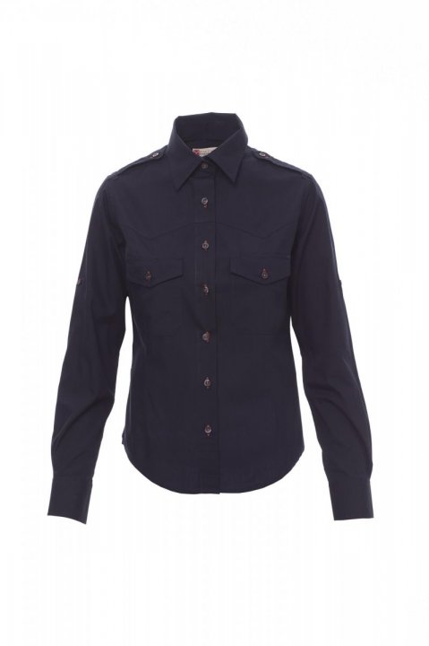 Taranmış ince pamuk dokumadan yapılmış kadın gömlek. Hafifçe vücuda oturan model. Önü robalı. Tek renk düğmeli ve kontrast renkte düğme delikli. Omuzları vatkalı. Göğsü kapaklı iki cepli ve kalem tutucu bölmeli. Pratik kol yuvarlaklığı için kol üzerinde düğmeli dokuma şeritli. Beyaz gömlek, kontrast düğme deliğine ve ön kısımda robaya sahip değildir. Hafif ütü gerektiren kumaştan yapılmıştır.