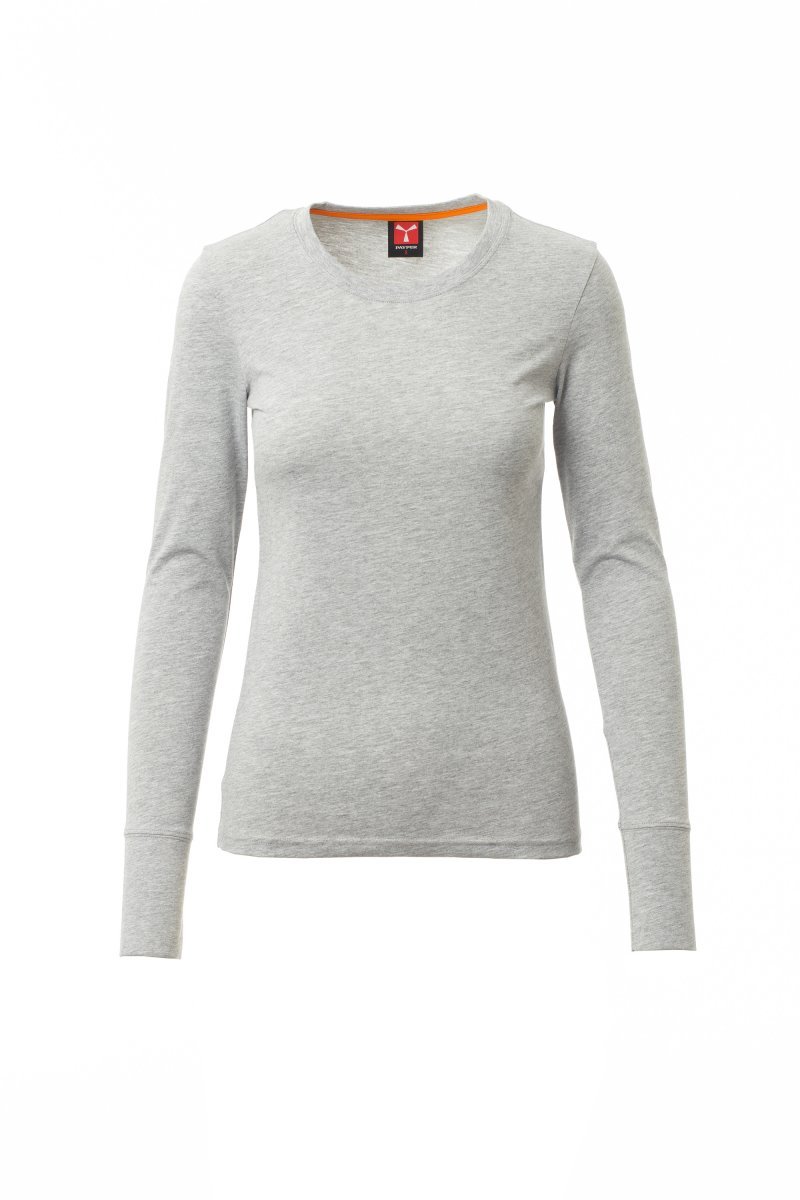 Yuvarlak yakalı ve uzun kollu vücuda oturan kadın tişört. Görünür kontrast renklerde omuzdan omuza streç takviye dikişli yaka kısmı 1,5 cm boyundadır, bilekleri uzundur ve ön kısmı bant dikişli olarak spandeks karışımlı ribanadan yapılmıştır. Yanları dikişlidir.