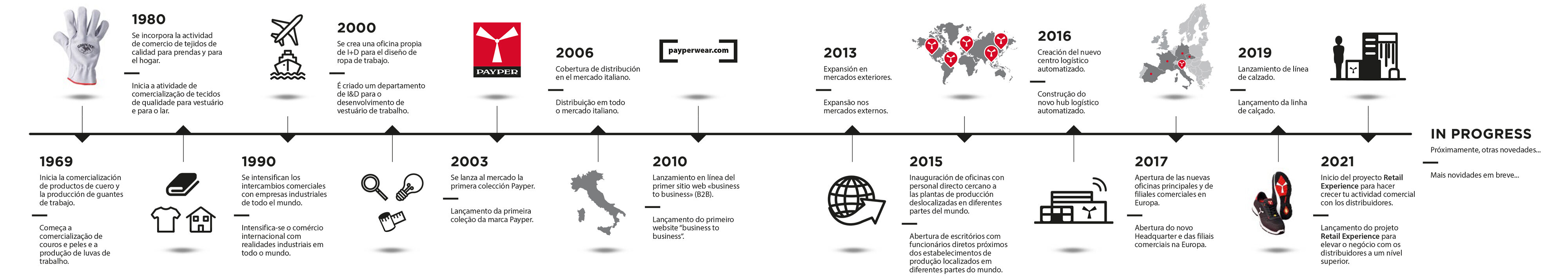 Payper nace de una idea de la familia Valentini, que, inspirada en la vida ejemplo del amigo piloto, decide dedicarse a la fabricación de ropa de trabajo y ropa para la empresa diseñada para facilitar los movimientos de las personas, protegerlas y equiparlas con productos que ofrecen una estética espe-cialmente cuidada, típica del estilo italiano. El crecimiento y la especialización desarrollada con el paso del tiempo dieron lugar, en 2003, al nacimiento de Industrial Wear, con el objetivo de industrializar las experiencias acumuladas, ampliar el catálogo de productos, potenciar los servicios y conquistar nuevas cuotas de mercado. En 2006, tras haber completado el mapa de distribución en todo el territorio italiano, la empresa inicio el desarrollo de sus ex-portaciones, llegando en pocos años a cubrir todos los principales mercados europeos. Actualmente cuenta con un catálogo con más de dos mil artículos, que disponen de patentes y numerosas certificaciones, a lo que hay que añadir más de cincuenta nuevas creaciones cada año procedentes de la oficina de I+D italiana, siempre a la búsqueda de nuevas soluciones estéticas y funcionales. Las producciones se gestionan y someten a precisos controles de calidad realizados directamente por el personal de las oficinas técnicas distribuidas en diferentes lugares del mundo. En 2017 se inauguró la nueva sede, unas modernas oficinas centrales que producen energía renovable, dotadas de una zona de exposición de 800 m², donde se puede ver toda la colección de Payper, y un almacén que cuenta con sistemas logísticos inteligentes de última generación.