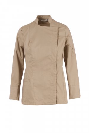 Dámský kuchařský rondon se stojáčkem, z bavlněného ripstopu a Lycry ® T400 ®, s vynikajícími elastickými a prodyšnými vlastnostmi, s pohodlnou síťovinou na zádech a v podpaží pro zvýšení prodyšnosti. Dvouřadé zapínání na patentky, klopa, kterou lze přeložit a připevnit ke hrudi pomocí zapínání na nezakrytý knoflík, a vytvořit tak efekt klopy na míru a inovativní výstřih do V. Dlouhé rukávy s košilovou manžetou se zapínáním na nezakrytou patentku. Ikonická tvarovaná nášivka na levém rameni, s výšivkou vrtule tón v tónu, doplněná kapsičkou na pero. Praktická kapsa na smartphone v pase.