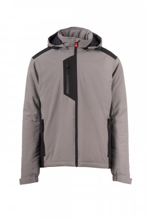 WP 8000 mm H₂O, WVT 5000 g/m² 24h. Pánský softshell 2 vrstvy, střední výplň (140g/m²), dvoubarevný, zapínání na zip s kovovým jezdcem „semi-auto lock“ a přizpůsobeným taháčkem. Odnímatelná kapuce se stahovací šňůrkou. Dvě boční kapsy na zip, jedna kapsa na hrudi s voděodolným zipem. Elastické stahovací manžety na suchý zip. Reflexní prvek na zádovém sedle. Dvě vnitřní kapsy, jedna tvarovaná na zip a druhá na tablet se zapínáním na suchý zip. Spodní část stažitelná pomocí přizpůsobených zarážek.