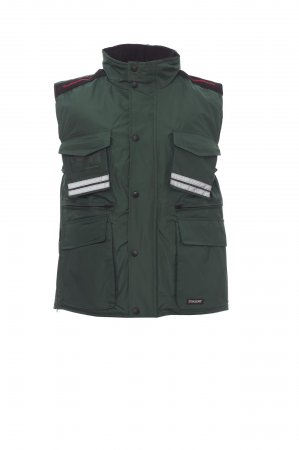 Ανδρικό γιλέκο, πλαστικό φερμουάρ 8 mm με μεταλλικό ολισθητήρα και με πλαστικό πτερύγιο και κουμπιά, αποσπώμενο ή/και πτυσσόμενο κάλυμμα στον γιακά, γκρίζες και κόκκινες αντανακλαστικές ταινίες στο μπροστινό μέρος, πλάγια σχισμή με φερμουάρ και φερμουάρ, εννέα εξωτερικές τσέπες, δύο από τις οποίες φέρουν ΣΥΣΤΗΜΑ ΚΛΕΙΔΩΜΑΤΟΣ, δύο με φερμουάρ και ενισχυμένο εσωτερικό, ένα με αναστρέψιμο κάτοχο εμβλήματος. Εσωτερικό: θήκη με επένδυση, γιακά, πλάτη και micro-fleece, κορδόνι στη μέση και εσωτερικό φερμουάρ για διευκόλυνση της εκτύπωσης και του κεντήματος.