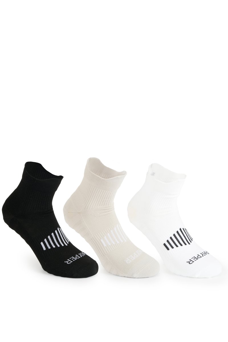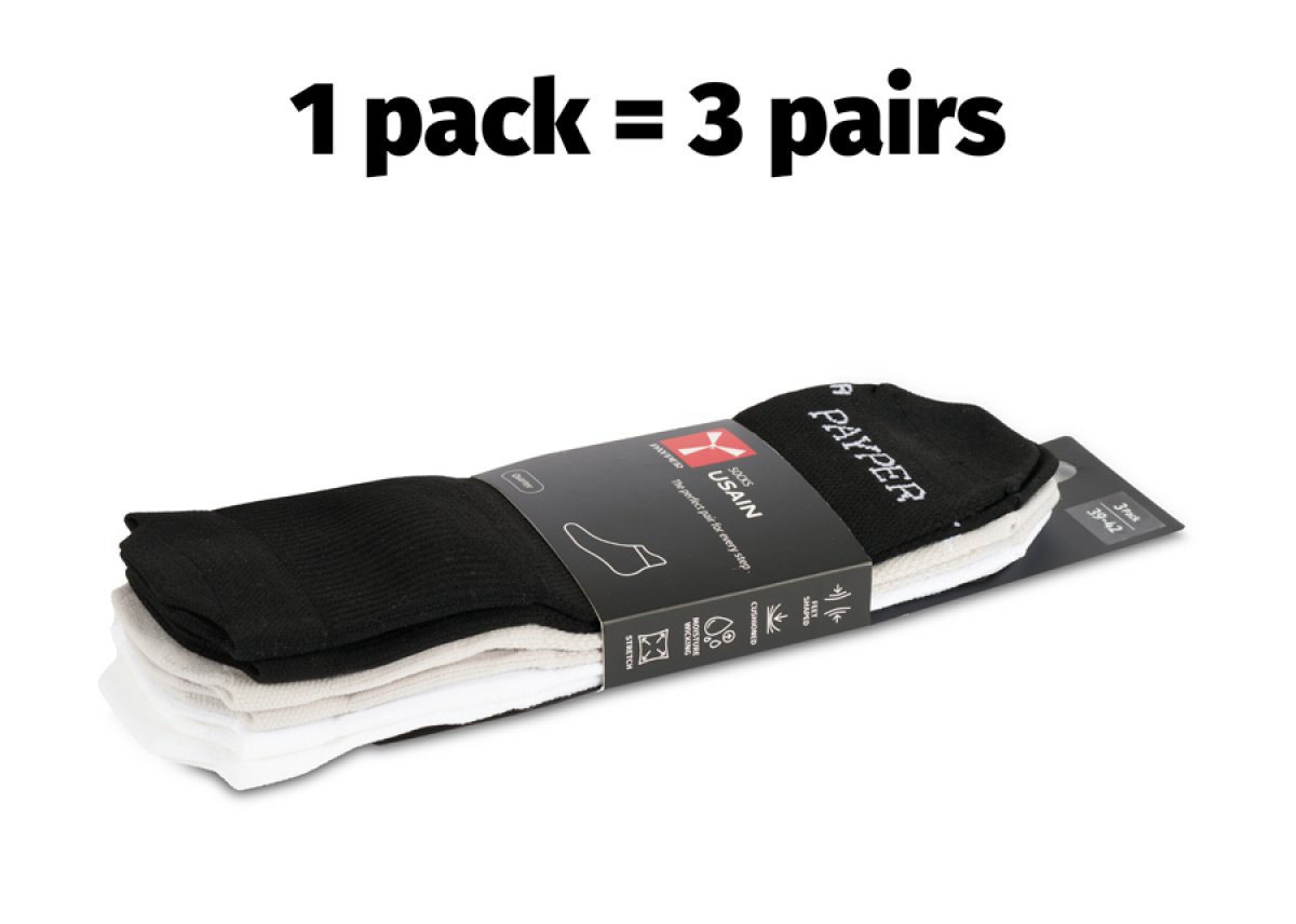 Sportske čarape s ojastučenom potporom na svodu stopala i stražnjem dijelu gležnja, uz ergonomski dio na gornjem dijelu stopala. Prepoznatljiva elisa robne marke Payper na stražnjem dijelu i logotip na prednjoj strani. Najmanja količina za prodaju: 1 paket od 6 komada (3 para po paketu). Težina se odnosi na par.