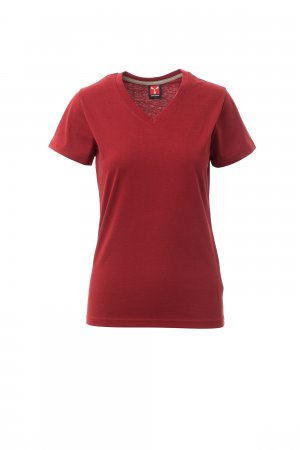 Női karcsúsított, V-nyakú póló 1,5 cm-es spandex kevertszálas bordázott nyakrésszel, felső szegéssel elöl, a nyakrész belső oldalán látható kontrasztos színű, válltól vállig érő anyagerősítéssel, sztreccsvarratok, oldalvarratok
